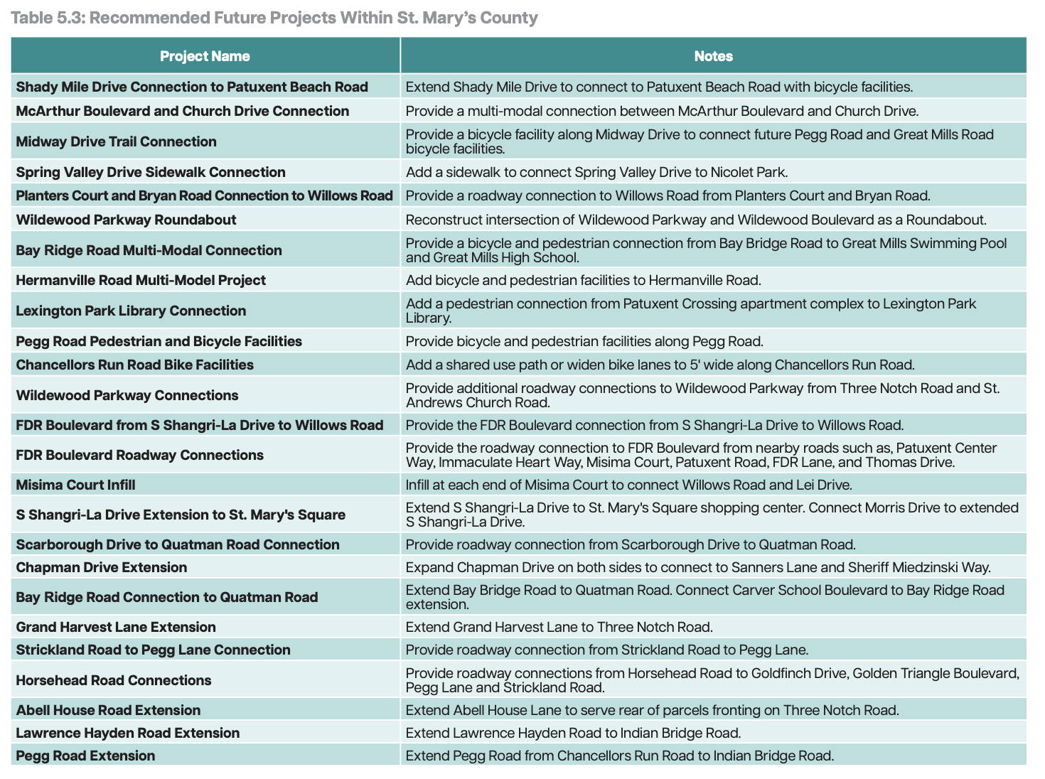 A list of 25 recommended future projects for St. Mary’s County managed roads are listed in Table 5.3. No costs are listed, but the county will probably have to foot the bill through capital improvement projects.