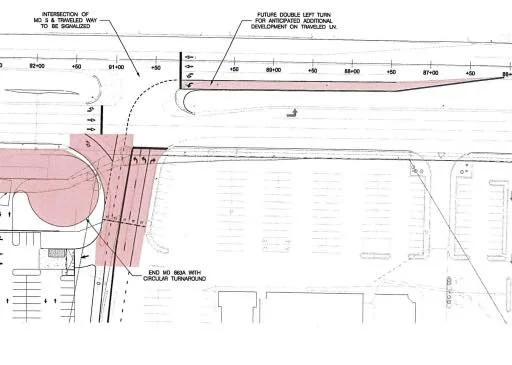 The Zoning Ordinance requires intersections within a Town Center to operate at a service level of C or better. With this development, the Route 5/Golden Beach Rd intersection would operate at a D service level. Recommendations include remarking lanes on Golden Beach Rd to have one left turn lane, one shared through/left turn lane, and one dedicated right turn lane. SB Route 5 will add a second left turn lane into the new development, while Traveled Lane will have two left turn lanes and a right turn lane (pictured below). The traffic study finds an additional 3,350 trips generated by Chick-Fil-A and 2,160 trips by Aldi.