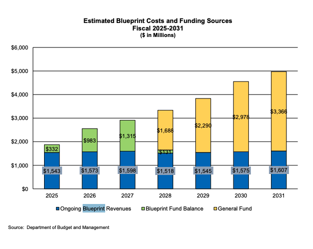 Looking ahead, Blueprint mandates continue to drive projected structural deficits in future years. Revenues dedicated to the Blueprint are expected to remain near $1.6 billion, while costs rise due to inflation, wages and increased service demand. As the Blueprint Fund balance declines, the General Fund is expected to shoulder a growing share of the cost, reaching more than $3.3 billion by 2031. Legislative action would be required to revise the Blueprint’s funding formulas to better align with local implementation realities. The General Assembly enacted the Blueprint in 2021 and adjusted its implementation timeline in 2022 and 2023.