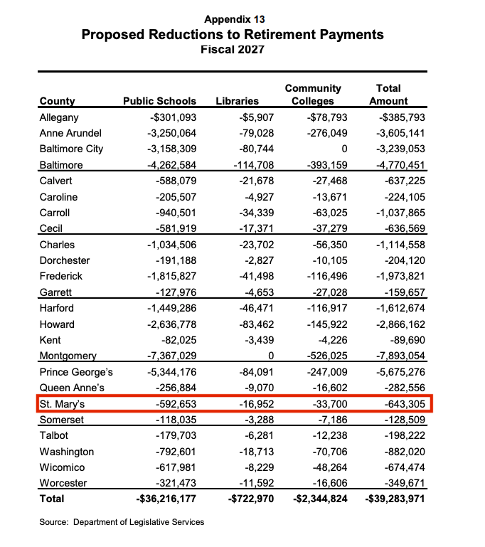 Under the proposal, counties statewide would be required to contribute an additional $39 million toward educator retirement benefits. St. Mary’s County’s share of that increase is projected to exceed $600,000, adding pressure to an already constrained local budget.