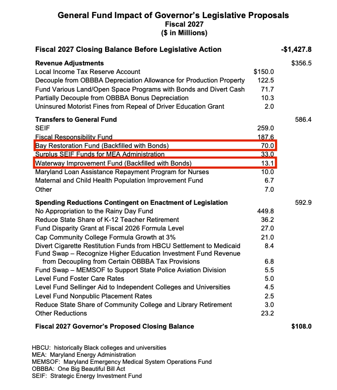 Second, the budget relies on debt to cover certain expenditures typically funded with cash. For example, the Bay Restoration Fund and the Waterway Improvement Fund are slated to receive $83 million, but that amount would be financed through bonds rather than cash. The approach frees up immediate revenue but shifts costs to taxpayers through long-term debt and interest payments.