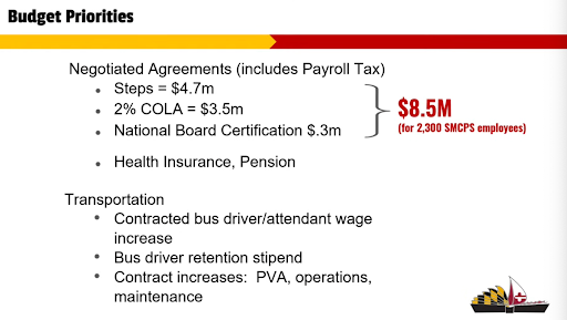 The budget funds negotiated agreements with the Education Association of St. Mary’s County and the St. Mary’s Association of Supervisors and Administrators, providing a 2% cost-of-living adjustment for employees. Contracted bus drivers and attendants will also receive wage increases, and bus drivers will receive a retention stipend. Additional major cost drivers include employee health insurance and pension expenses, which together total $8.5 million across approximately 2,300 employees. To cover those costs, the Board of Education plans to request an additional $9 million from the County Commissioners.