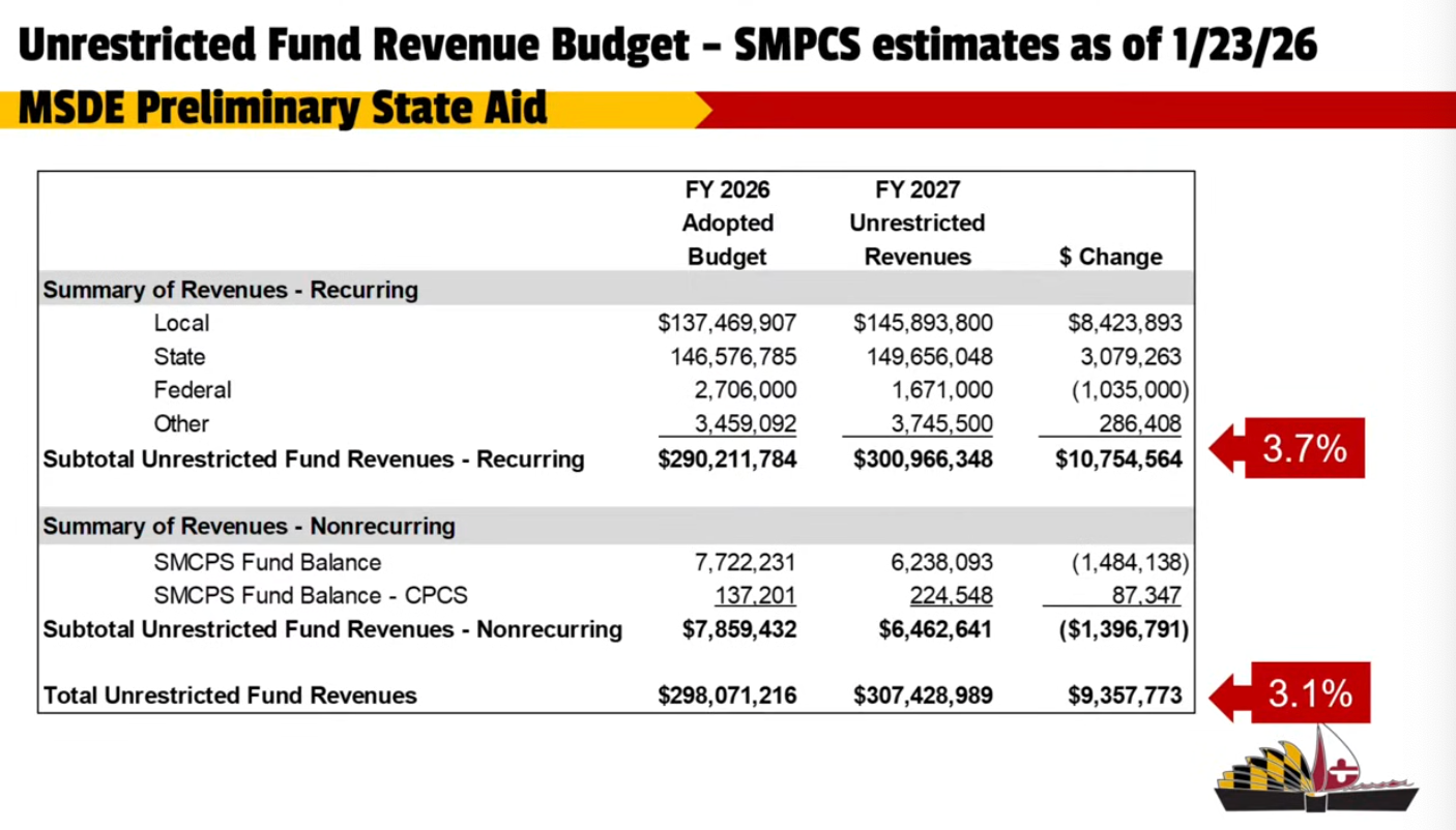 The St. Mary’s County Board of Education is expected to approve the superintendent’s proposed FY2027 budget this week following several work sessions and a public hearing at which two people testified. The finalized proposal reflects staff reductions driven by declining enrollment and decreases in federal and state funding in certain categories.