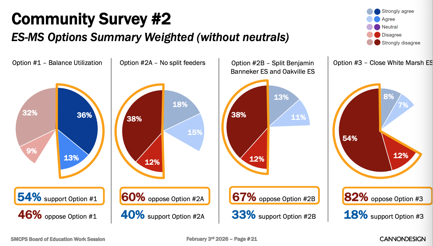 Despite its lack of public support, Cannon recommended Option 3 because it most closely aligned with criteria provided by the Board of Education and with several broad community priorities identified through survey responses. Cannon said enrollment should be monitored over the next two years to determine whether current declines continue. If so, White Marsh would close after the 2027–28 school year, with redistricting at the elementary and middle school levels occurring the following year.