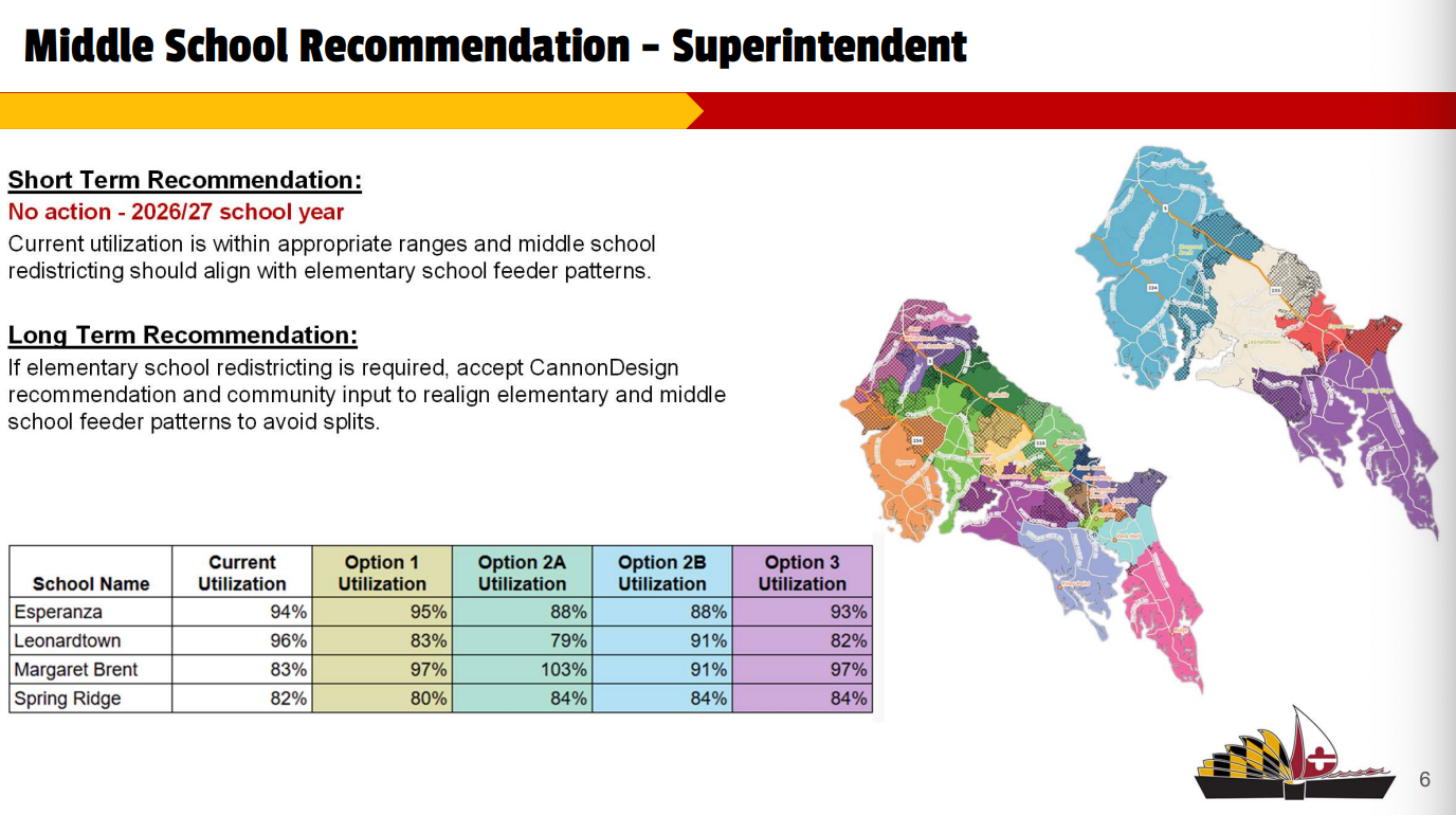 Middle schools would only be redistricted if elementary schools are, and no changes are proposed for next school year. If elementary redistricting occurs, Smith recommended proceeding with Cannon’s middle school alignment plan, which avoids splitting feeder patterns. Chief Operating Officer Mike Watson said Cannon’s Option 3 for middle schools would place Leonardtown Middle School, where the most growth is expected, at 82% utilization, leaving capacity available.